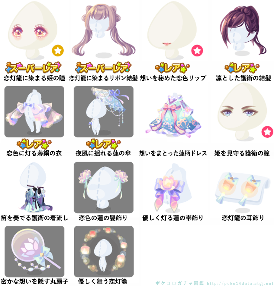 ★恋灯籠に染まる姫の瞳(セレクトアイ)(顔パーツ) ★恋灯籠に染まるリボン結髪 ☆想いを秘めた恋色リップ(顔パーツ) ☆凛とした護衛の結髪 ☆恋色に灯る薄絹の衣 ☆夜風に揺れる蓮の傘 想いをまとった蓮柄ドレス 姫を見守る護衛の瞳(顔パーツ) 笛を奏でる護衛の着流し 恋色の蓮の髪飾り 優しく灯る蓮の帯飾り 恋灯籠の耳飾り 密かな想いを隠す丸扇子 優しく舞う恋灯籠