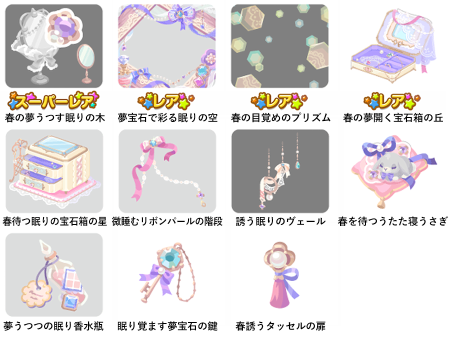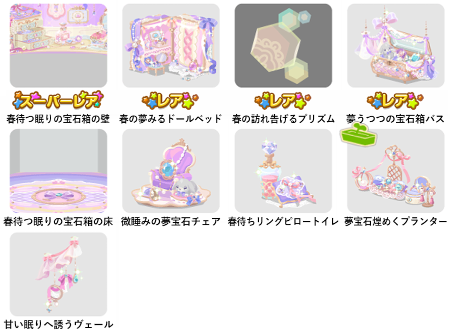 ★春待つ眠りの宝石箱の壁 ☆春の夢みるドールベッド ☆春の訪れ告げるプリズム ☆夢うつつの宝石箱バス 春待つ眠りの宝石箱の床 微睡みの夢宝石チェア 春待ちリングピロートイレ 夢宝石煌めくプランター 甘い眠りへ誘うヴェール