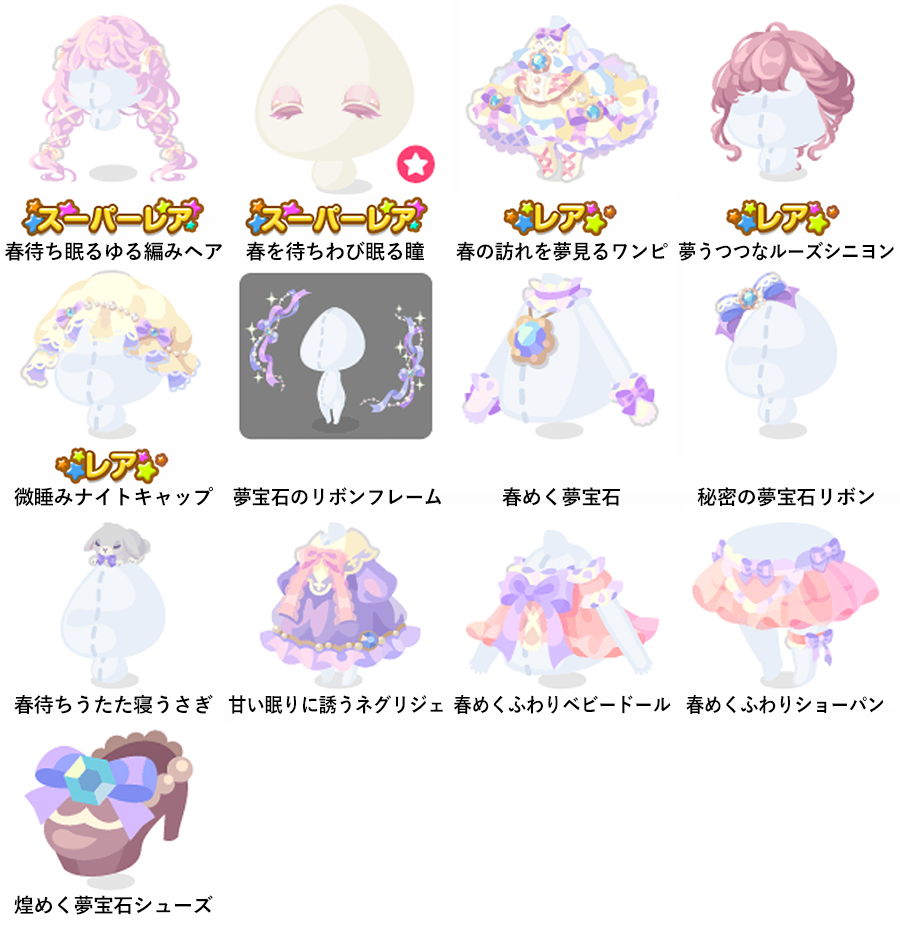 ★春待ち眠るゆる編みヘア ★春を待ちわび眠る瞳(顔パーツ) ☆春の訪れを夢見るワンピ ☆夢うつつなルーズシニヨン ☆微睡みナイトキャップ 夢宝石のリボンフレーム 春めく夢宝石 秘密の夢宝石リボン 春待ちうたた寝うさぎ 甘い眠りに誘うネグリジェ 春めくふわりベビードール 春めくふわりショーパン 煌めく夢宝石シューズ