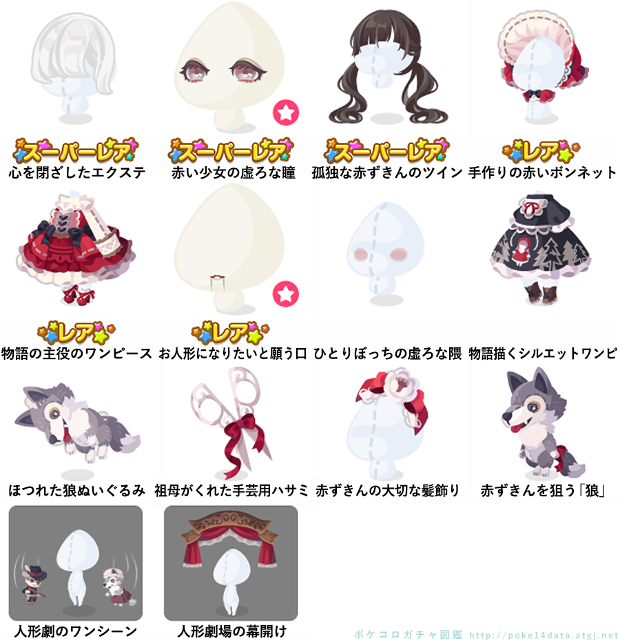 ★孤独の人形劇の壁 ☆孤独な赤ずきん(ネイロアイテム) ☆孤独に閉ざされた遊び場 ☆おばあさん装う狼のベッド 孤独の人形劇の床 狼を捜す猟師のお風呂 劇中の小道具トイレ 暗い森へ誘う狼 大事な裁縫道具プランター