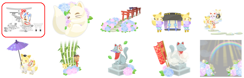 ★水無月白鳥居の木 No.397 嫁入りお稲荷さん水無月白鳥居の実 ☆夢見るあじさい狐の星 鳥居へ続くあじさいの丘 花嫁駕籠の扉 嫁入り行列の階段 提灯持ちと傘持ち狐 あじさい茂み子狐 はらはら葉っぱの狛狐 こんこん変化の狛狐 ☆狐の嫁入りの空