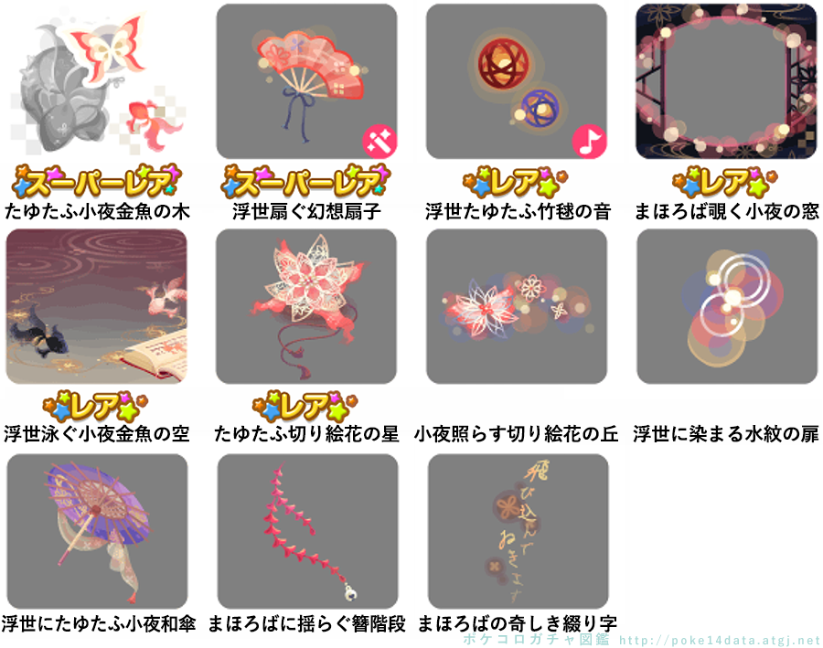 ★浮世たゆたふ小夜金魚の壁 ★浮世映す奇しき和傘(パターンアイテム) ☆浮世たゆたふ小夜金魚(ネイロアイテム) 金魚の招く浮世風呂 浮世たゆたふ小夜金魚の床 金魚たちのまほろば寝床 小夜照らす竹毬トイレ 金魚模す浮世飾り 金魚の心慰プランター