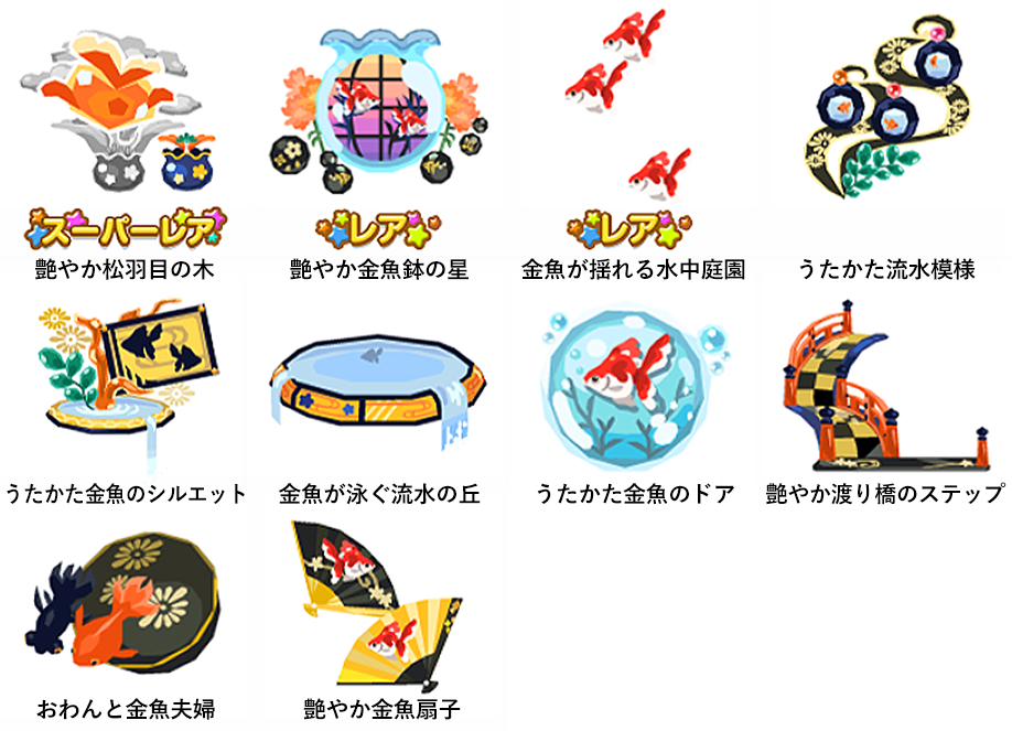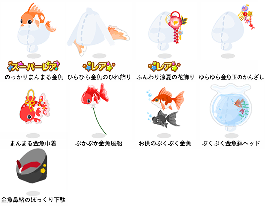 ★のっかりまんまる金魚 ☆ひらひら金魚のひれ飾り ☆ふんわり涼夏の花飾り ゆらゆら金魚玉のかんざし まんまる金魚巾着 ぷかぷか金魚風船 お供のぷくぷく金魚 ぷくぷく金魚鉢ヘッド 金魚鼻緒のぽっくり下駄