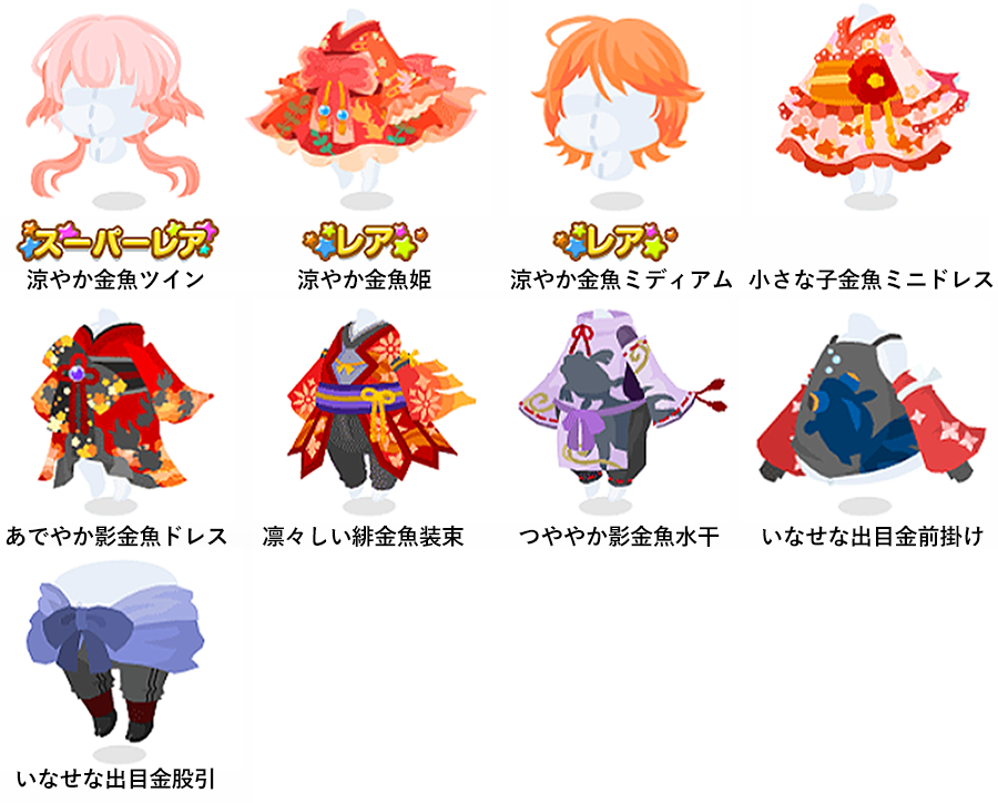 ★涼やか金魚ツイン ☆涼やか金魚姫 ☆涼やか金魚ミディアム 小さな子金魚ミニドレス あでやか影金魚ドレス 凛々しい緋金魚装束 つややか影金魚水干 いなせな出目金前掛け いなせな出目金股引