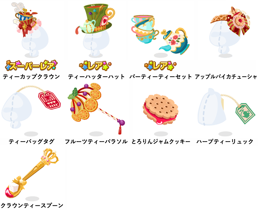 ★ティーカップクラウン ☆ティーハッターハット ☆パーティーティーセット アップルパイカチューシャ ティーバッグタグ フルーツティーパラソル とろりんジャムクッキー ハーブティーリュック クラウンティースプーン