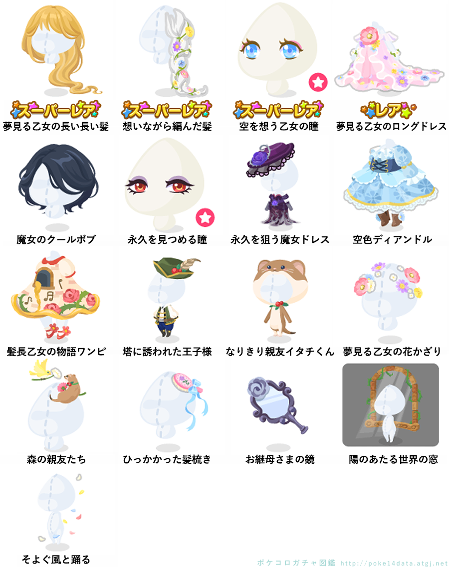 ★夢見る乙女の長い長い髪 ★想いながら編んだ髪 ★空を想う乙女の瞳(顔パーツ) ☆夢見る乙女のロングドレス 魔女のクールボブ 永久を見つめる瞳(顔パーツ) 永久を狙う魔女ドレス 空色ディアンドル 髪長乙女の物語ワンピ 塔に誘われた王子様 なりきり親友イタチくん 夢見る乙女の花かざり 森の親友たち ひっかかった髪梳き お継母さまの鏡 陽のあたる世界の窓 そよぐ風と踊る