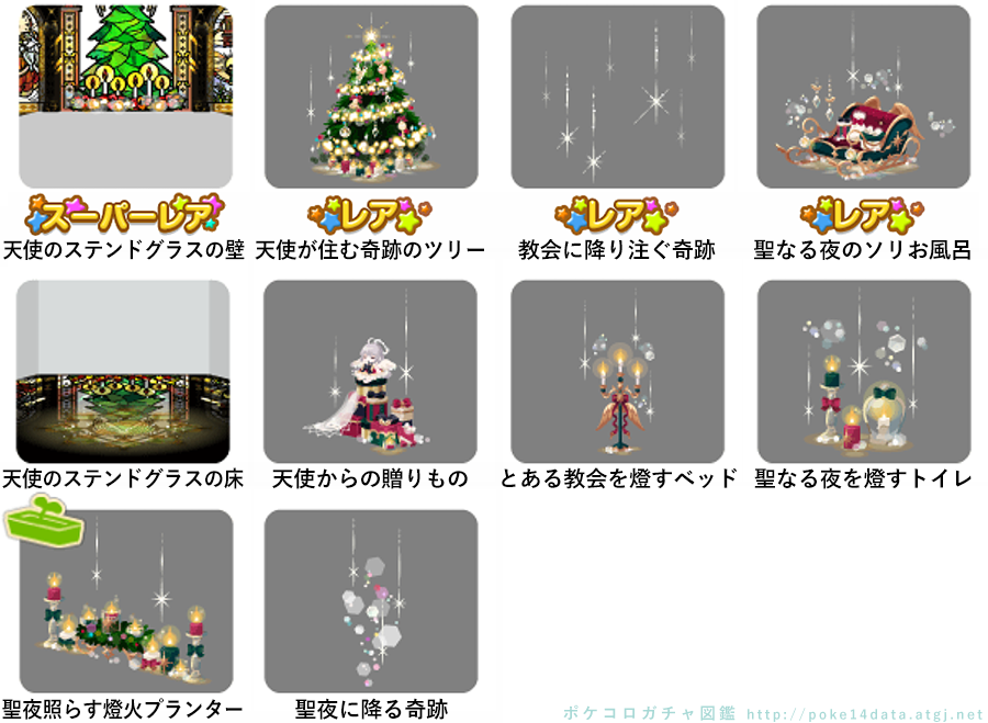 ★天使のステンドグラスの壁 ☆天使が住む奇跡のツリー ☆教会に降り注ぐ奇跡 ☆聖なる夜のソリお風呂 天使のステンドグラスの床 天使からの贈りもの とある教会を燈すベッド 聖なる夜を燈すトイレ 聖夜照らす燈火プランター 聖夜に降る奇跡