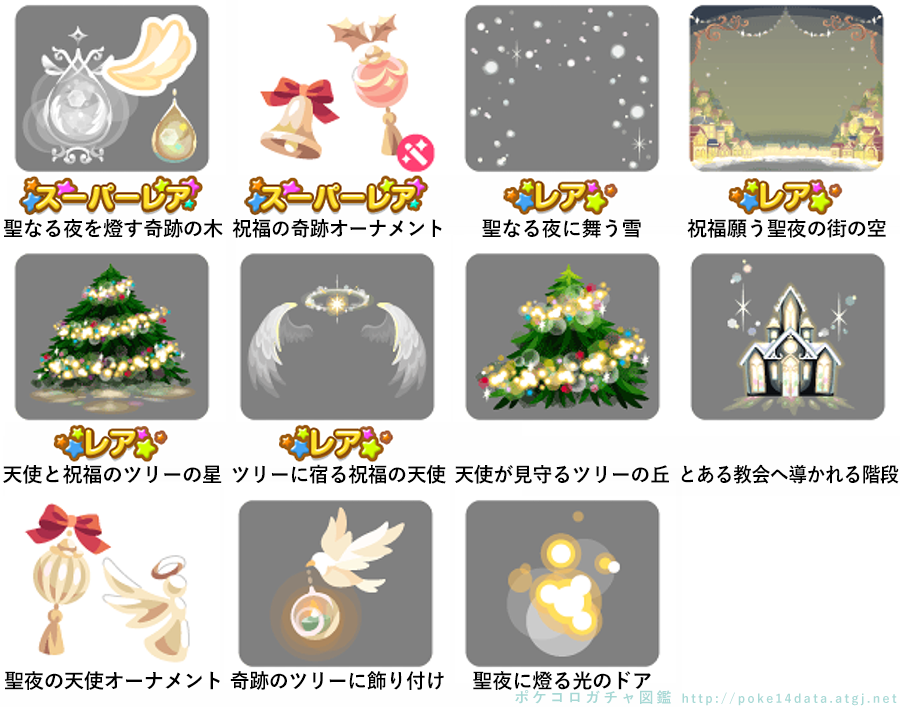 ★聖なる夜を燈す奇跡の木 No.1487 聖なる夜のポタージュ 奇跡を秘めた羽の実 ★祝福の奇跡オーナメント(フィルターアイテム) ☆聖なる夜に舞う雪 ☆祝福願う聖夜の街の空 ☆天使と祝福のツリーの星 ☆ツリーに宿る祝福の天使 天使が見守るツリーの丘 とある教会へ導かれる階段 聖夜の天使オーナメント 奇跡のツリーに飾り付け 聖夜に燈る光のドア