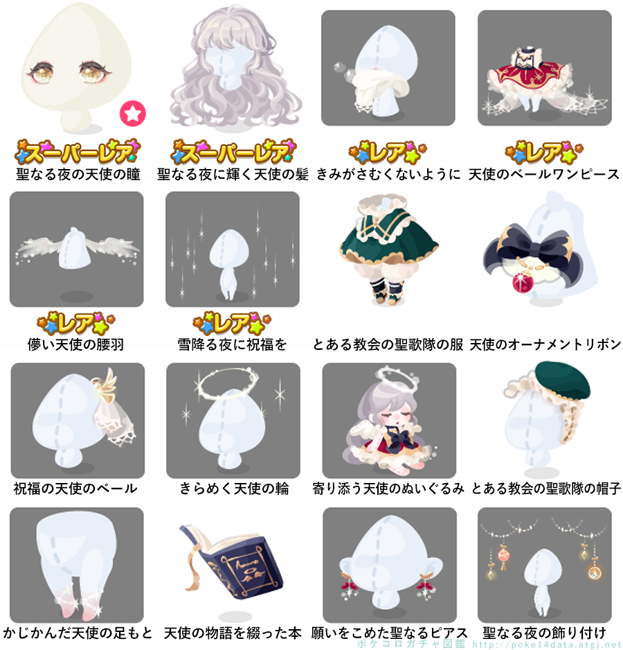 ★聖なる夜の天使の瞳(顔パーツ) ★聖なる夜に輝く天使の髪 ☆きみがさむくないように ☆天使のベールワンピース ☆儚い天使の腰羽 ☆雪降る夜に祝福を とある教会の聖歌隊の服 天使のオーナメントリボン 祝福の天使のベール きらめく天使の輪 寄り添う天使のぬいぐるみ とある教会の聖歌隊の帽子 かじかんだ天使の足もと 天使の物語を綴った本 願いをこめた聖なるピアス 聖なる夜の飾り付け