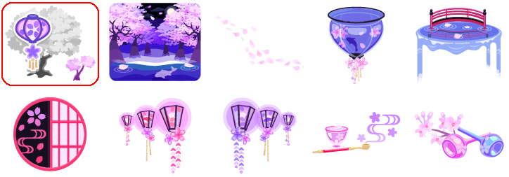 ★花嵐の夜辺の壁 ☆嵐の前の桜樹 ☆花嵐の夜辺の床 静寂を破る花嵐 艶やか花魁の寝所 桜切子の湯処 桜ガラスの手水 静寂な水辺の桜 妖艶夜桜の提灯 妖艶堅牢な柵