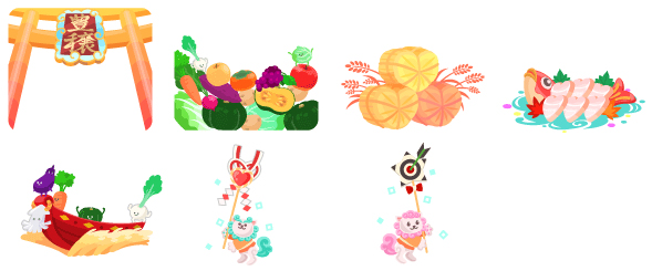 ☆豊作祈願神社の鳥居 ☆豊作御礼!秋の味覚の空 豊作ハート米俵の星 いつの日かの鯛のお造り 豊穣宝船と野菜たちの階段 豊作祝いの舞・あ 豊作祝いの舞・うん