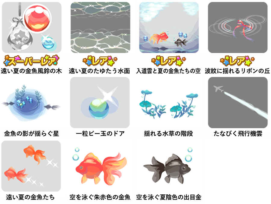 ★遠い夏の金魚の壁 ☆たゆたう水面と夏の光 ☆遠い夏の金魚(ネイロアイテム) ☆お気に入りの金魚鉢ベッド ☆遠い夏の金魚の床 ゆらゆら踊る、夏色の瓶(アクションアイテム) カラフルビー玉のお風呂 レトロボトルトイレ 夏の日の逃げ水ラグ