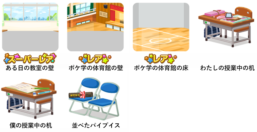 ★ある日の教室の壁 ☆ポケ学の体育館の壁 ☆ポケ学の体育館の床 わたしの授業中の机 僕の授業中の机 並べたパイプイス