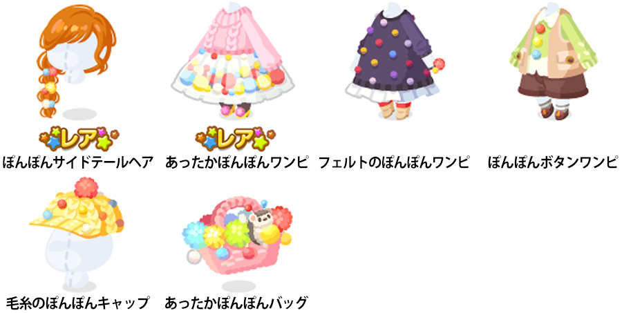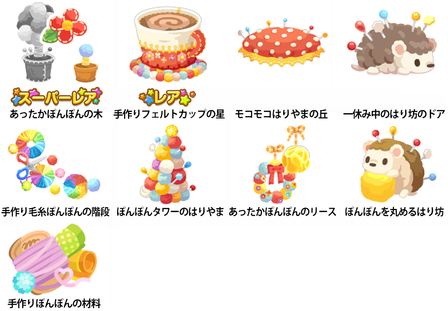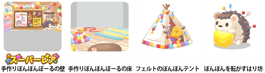 【ピックアップガチャで復刻】 ・2018.12.08〜2018.12.17 『ぬくぬくあったかウィンター』 (フェルトのぽんぽんテント・あったかぽんぽんの木 ・手作りぽんぽんの材料) 【イベントで復刻】 ・2020.12.27〜2021.01.07 『ぽけころ祭〜年越し冬祭り〜』