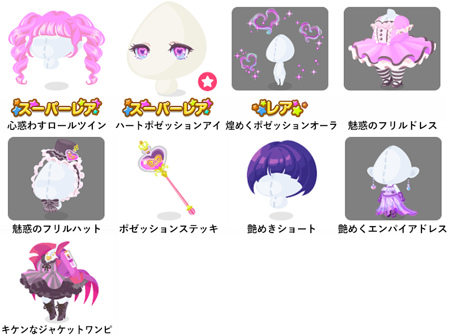 ★心惑わすロールツイン ★ハートポゼッションアイ(顔パーツ) ☆煌めくポゼッションオーラ 魅惑のフリルドレス 魅惑のフリルハット ポゼッションステッキ 艶めきショート 艶めくエンパイアドレス キケンなジャケットワンピ