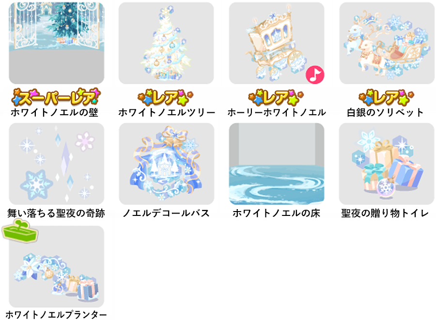 ★ホワイトノエルの壁 ☆ホワイトノエルツリー ☆ホーリーホワイトノエル(ネイロアイテム) ☆白銀のソリベット 舞い落ちる聖夜の奇跡 ノエルデコールバス ホワイトノエルの床 聖夜の贈り物トイレ ホワイトノエルプランター