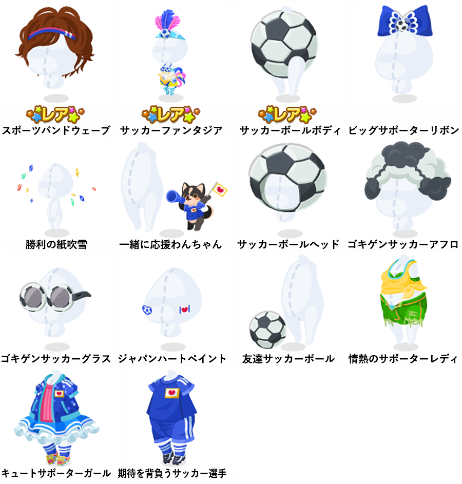 ☆スポーツバンドウェーブ ☆サッカーファンタジア ☆サッカーボールボディ ビッグサポーターリボン 勝利の紙吹雪 一緒に応援わんちゃん サッカーボールヘッド ゴキゲンサッカーアフロ ゴキゲンサッカーグラス ジャパンハートペイント 友達サッカーボール 情熱のサポーターレディ キュートサポーターガール //poke14data.atgj.net/ポケコロの星/体育の日2017 期待を背負うサッカー選手