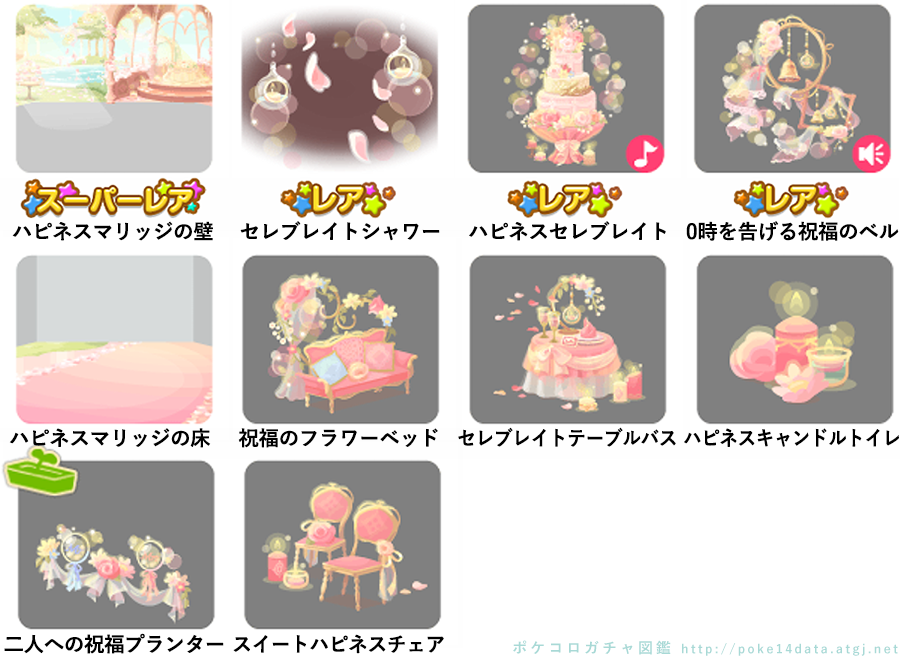 ★ハピネスマリッジの壁 ☆セレブレイトシャワー ☆ハピネスセレブレイト(ネイロアイテム) ☆0時を告げる祝福のベル(サウンド付) ハピネスマリッジの床 祝福のフラワーベッド セレブレイトテーブルバス ハピネスキャンドルトイレ 二人への祝福プランター スイートハピネスチェア
