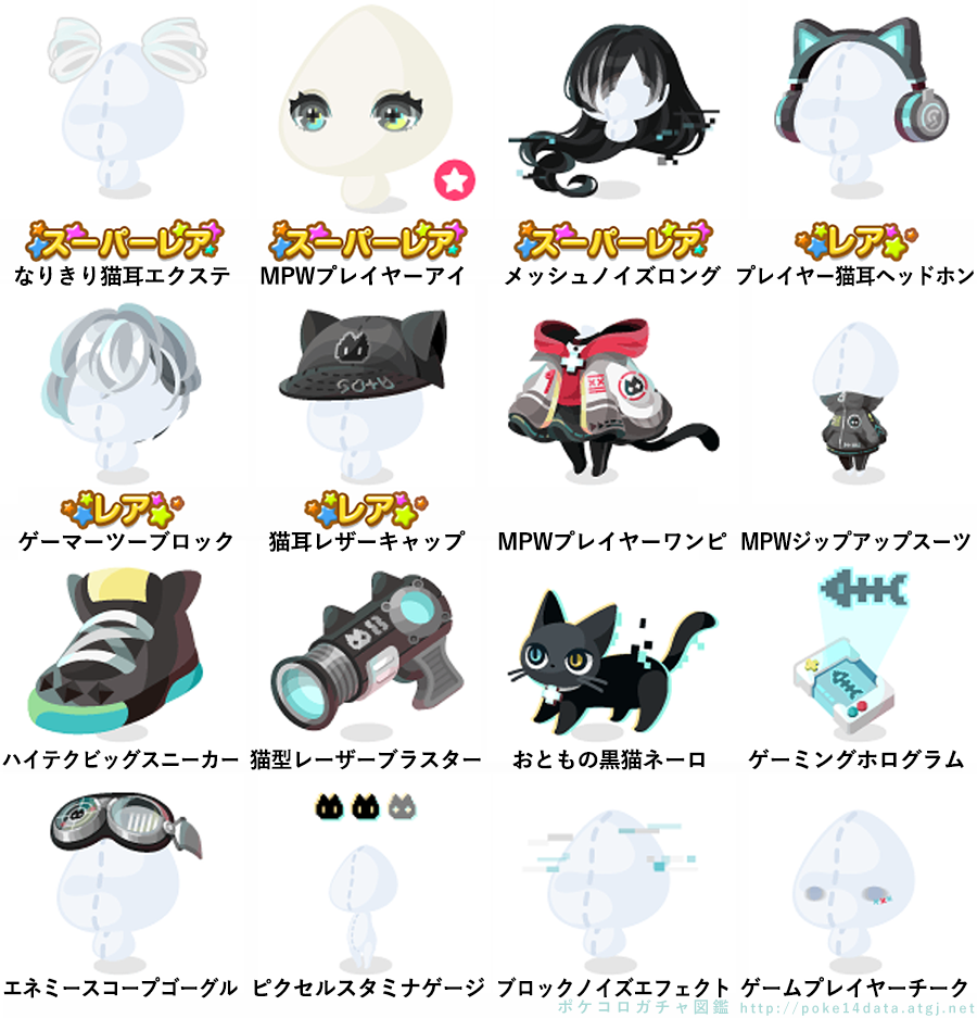 ★なりきり猫耳エクステ ★MPWプレイヤーアイ(顔パーツ) ★メッシュノイズロング ☆プレイヤー猫耳ヘッドホン ☆ゲーマーツーブロック ☆猫耳レザーキャップ MPWプレイヤーワンピ MPWジップアップスーツ ハイテクビッグスニーカー 猫型レーザーブラスター おともの黒猫ネーロ ゲーミングホログラム エネミースコープゴーグル ピクセルスタミナゲージ ブロックノイズエフェクト ゲームプレイヤーチーク