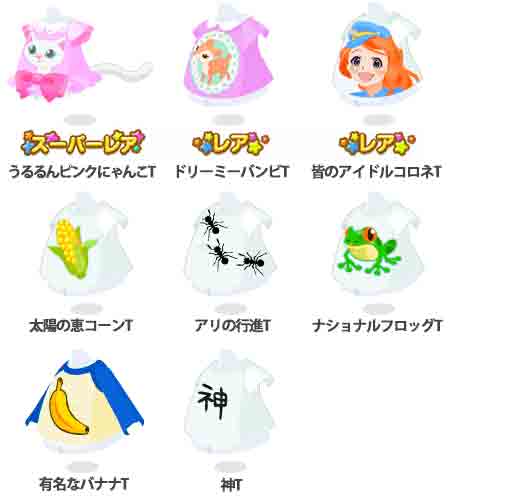 ★うるるんピンクにゃんこT ☆ドリーミーバンビT ☆皆のアイドルコロネT 太陽の恵コーンT アリの行進T ナショナルフロッグT 有名なバナナT 神T