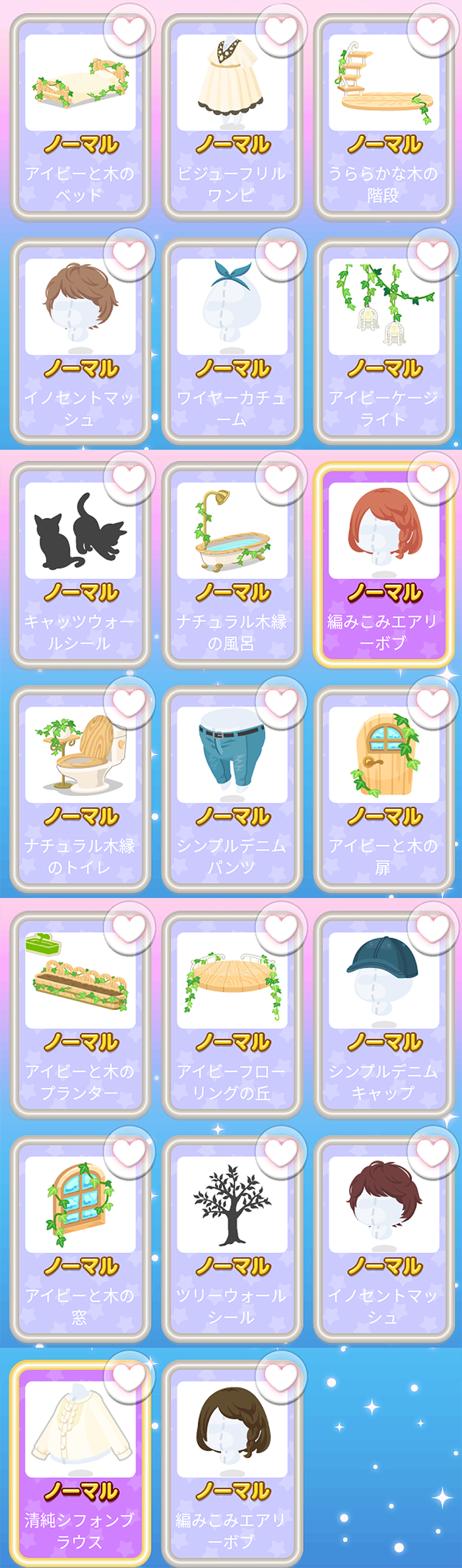 アイビーと木のベッド ビジューフリルワンピ うららかな木の階段 イノセントマッシュ ワイヤーカチューム アイビーケージライト キャッツウォールシール ナチュラル木縁の風呂 編みこみエアリーボブ ナチュラル木縁のトイレ シンプルデニムパンツ アイビーと木の扉 アイビーと木のプランター アイビーフローリングの丘 シンプルデニムキャップ アイビー と木の窓 ツリーウォールシール イノセントマッシュ 清純シフォンブラウス 編みこみエアリーボブ