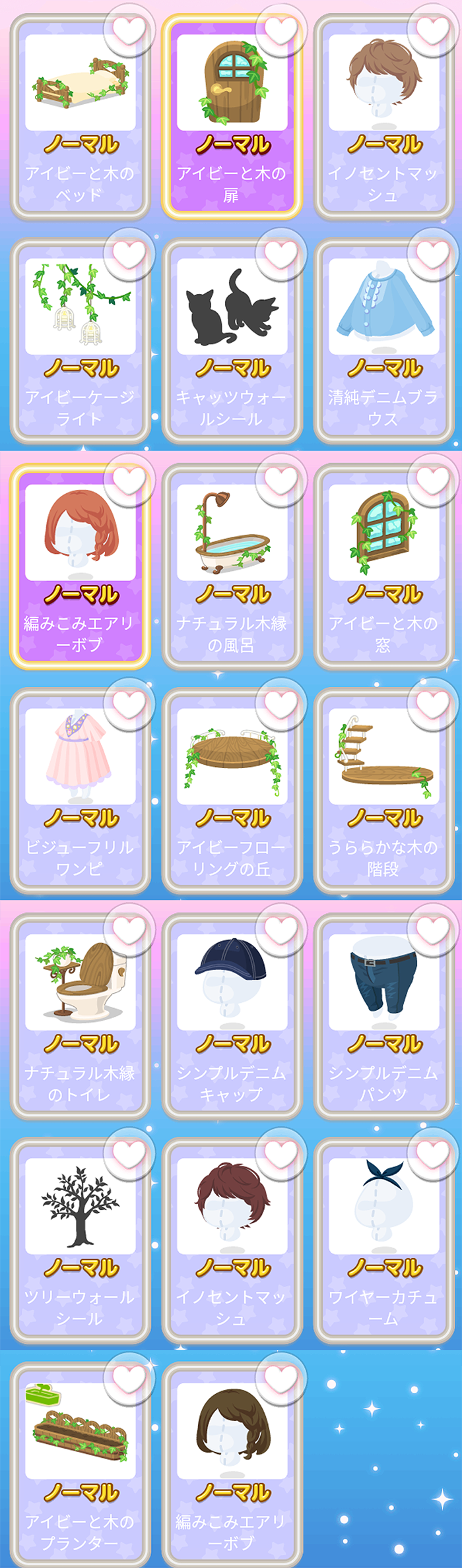 アイビーと木のベッド アイビーと木の扉 イノセントマッシュ アイビーケージライト キャッツウォールシール 清純デニムブラウス 編みこみエアリーボブ ナチュラル木縁の風呂 アイビーと木の窓 ビジューフリルワンピ アイビーフローリングの丘 うららかな木の階段 ナチュラル木縁のトイレ シンプルデニムキャップ シンプルデニムパンツ ツリーウォールシール イノセントマッシュ ワイヤーカチューム アイビーと木のプランター 編みこみエアリーボブ