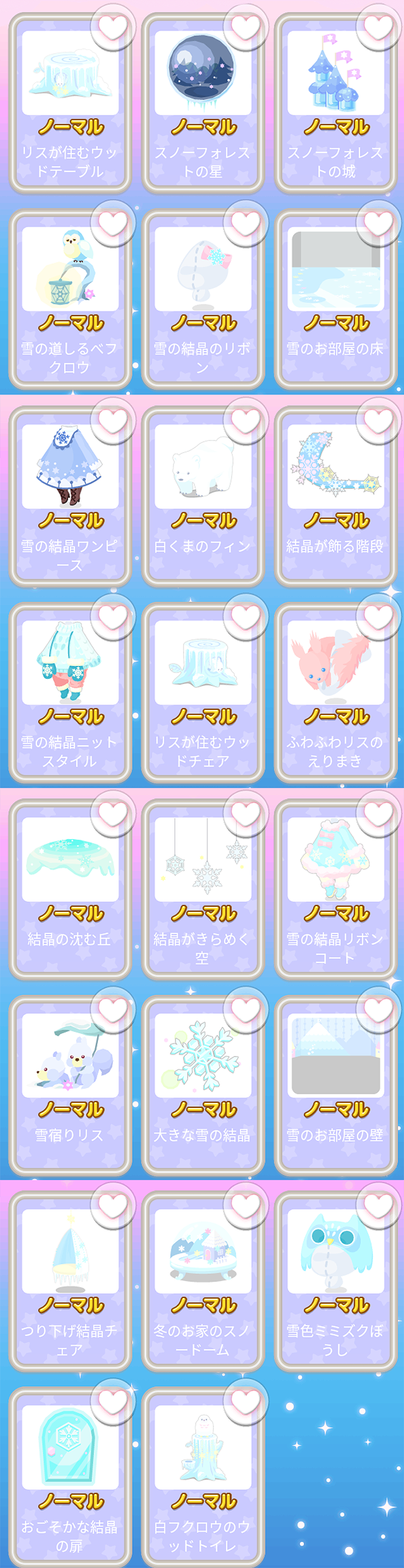 リスが住むウッドテーブル スノーフォレストの星 スノーフォレストの城 雪の道しるべフクロウ 雪の結晶のリボン 雪のお部屋の床 雪の結晶ワンピース 白くまのフィン 結晶が飾る階段 雪の結晶ニットスタイル リスが住むウッドチェア ふわふわリスのえりまき 結晶の沈む丘 結晶がきらめく空 雪の結晶リボンコート 雪宿りリス 大きな雪の結晶 雪のお部屋の壁 つり下げ結晶チェア 雪のお家のスノードーム 雪色ミミズクぼうし おごそかな結晶の扉 白フクロウのウッドトイレ