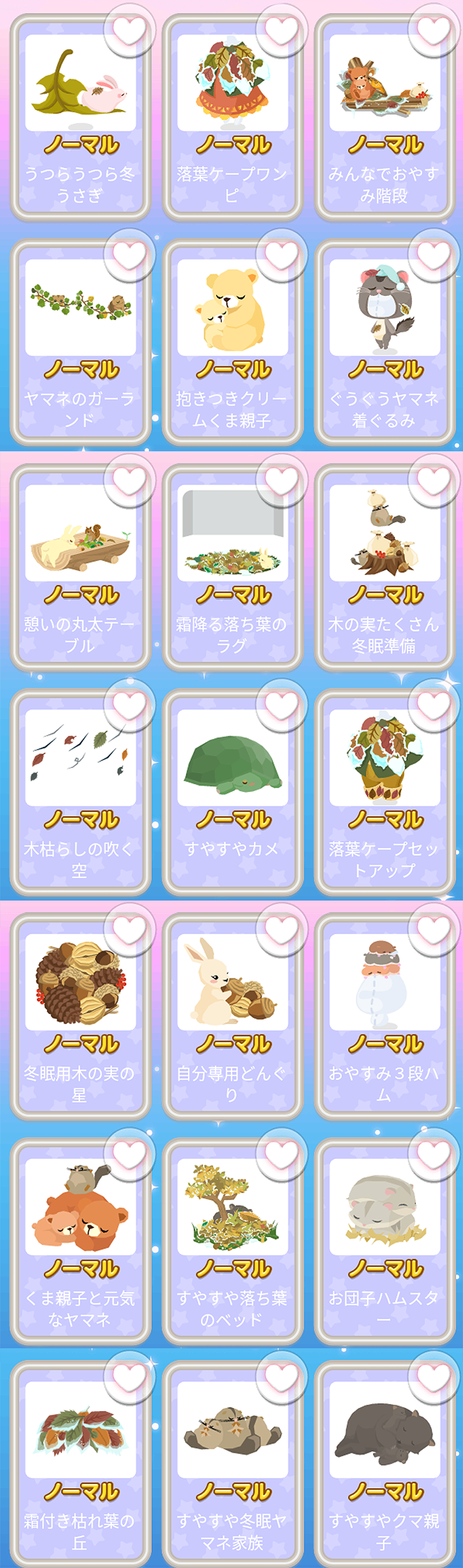 うつらうつら冬うさぎ 落葉ケープワンピ みんなでおやすみ階段 ヤマネのガーランド 抱きつきクリームくま親子 ぐうぐうヤマネ着ぐるみ 憩いの丸太テーブル 霜降る落ち葉のラグ 木の実たくさん冬眠準備 木枯らしの吹く空 すやすやカメ 落葉ケープセットアップ 冬眠用木の実の星 自分専用どんぐり おやすみ3段ハム くま親子と元気なヤマネ すやすや落ち葉のベッド お団子ハムスター 霜付き枯れ葉の丘 すやすや冬眠ヤマネ家族 すやすやクマ親子