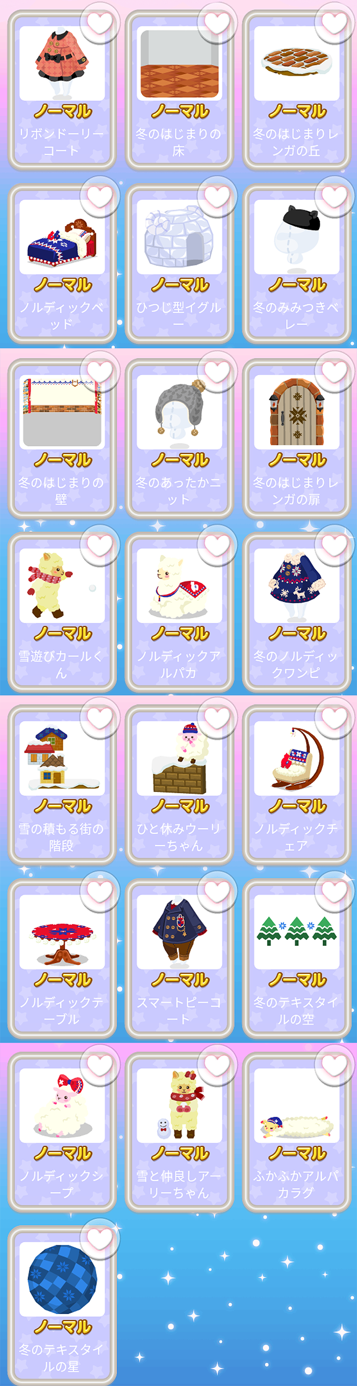 リボンドーリーコート 冬のはじまりの床 冬のはじまりレンガの丘 ノルディックベッド ひつじ型イグルー 冬のみみつきベレー 冬のはじまりの壁 冬のあったかニット 冬のはじまりレンガの扉 雪遊びカール君 ノルディックアルパカ 冬のノルディックワンピ 雪の積もる街の階段 ひと休みウーリーちゃん ノルディックチェア ノルディックテーブル スマートピーコート 冬のテキスタイルの空 ノルディックシープ 雪と仲良しアーリーちゃん ふかふかアルパカラグ 冬のテキスタイルの星