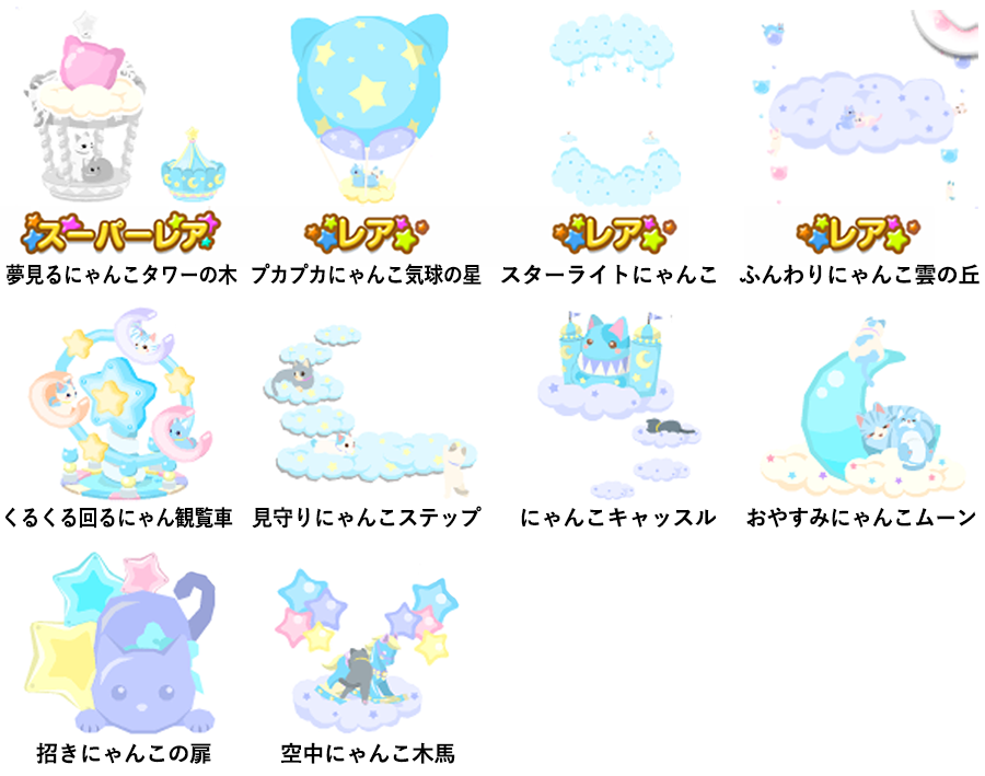 ★夢見るにゃんこタワーの木 No.276 サマーにゃんこ冷麺 夢見るにゃんこの実 ☆プカプカにゃんこ気球の星 ☆スターライトにゃんこ ☆ふんわりにゃんこ雲の丘 くるくる回るにゃん観覧車 見守りにゃんこステップ にゃんこキャッスル おやすみにゃんこムーン 招きにゃんこの扉 空中にゃんこ木馬
