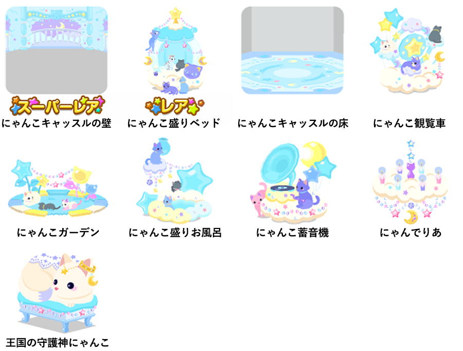 ★にゃんこキャッスルの壁 ☆にゃんこ盛りベッド にゃんこキャッスルの床 にゃんこ観覧車 にゃんこガーデン にゃんこ盛りお風呂 にゃんこ蓄音機 にゃんでりあ 王国の守護神にゃんこ