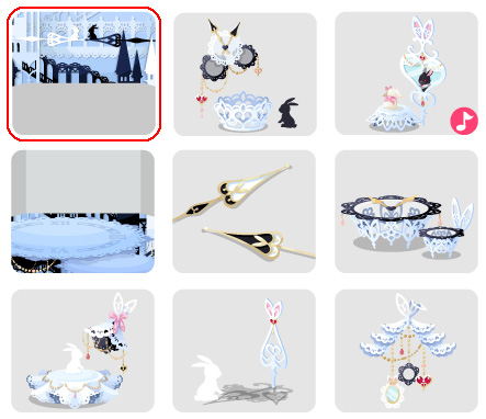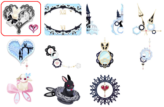 ★時の国の壁 ☆オルロージュのお風呂 ☆鏡越しの二人の時間(ネイロアイテム) ☆時の国の床 時計の針の奥に臨むのは… 時を刻むテーブルセット ラパンブランシュベッド 影時計のトイレ ラパンレースチャーム