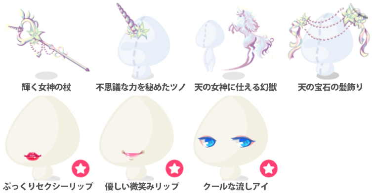 ★輝く神秘のロング ★天の女神の瞳(顔パーツ) ★フラワリーパープルアイ(顔パーツ) ★キュートウインクアイ(顔パーツ) ☆透き通る女神のドレス ☆きらめく女神のチーク ☆不思議な幻獣セット ☆天の女神の微笑み(顔パーツ) ☆ぱっちりシャイニーアイ(顔パーツ) ☆エレガントブルーアイ(顔パーツ) ☆ムーディーレッドアイ(顔パーツ) 輝く女神の杖 不思議な力を秘めたツノ 天の女神に仕える幻獣 天の宝石の髪飾り ぷっくりセクシーリップ(顔パーツ) 優しい微笑みリップ(顔パーツ) クールな流しアイ(顔パーツ)