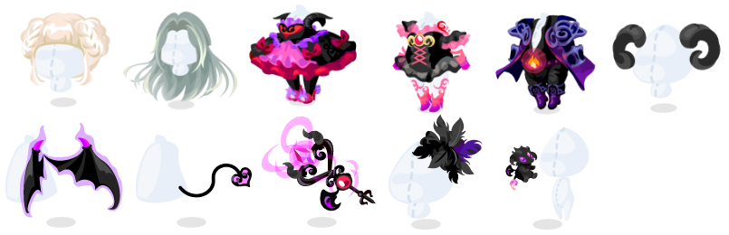 ★契約の悪魔シニョン 契約の悪魔ロング ☆リリスの小悪魔ドレス 誘う夢魔ドレス ルシファーのお召し物 ☆契約の悪魔の角 契約の悪魔の羽 契約の悪魔の尾 闇の力を宿す杖 黒耀の羽飾り ぱたぱた幻獣クロア