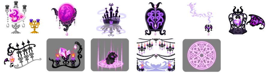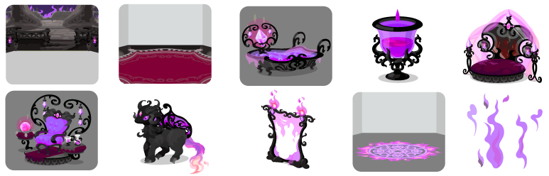 ★誘われし悪魔城の壁 誘われし悪魔城の床 闇の晩餐風呂 悪魔の杯トイレ ☆祭壇の儀式ベッド ☆悪魔城の玉座 城を守りし幻獣クロア 闇との境界衝立 闇を喚び寄せるラグ 舞い上がりし煉獄の炎