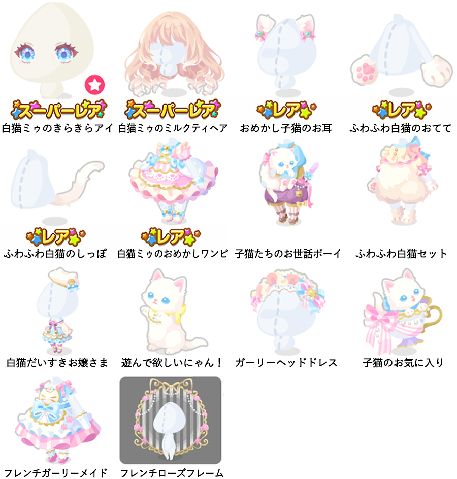 ★白猫ミゥのきらきらアイ(顔パーツ) ★白猫ミゥのミルクティヘア ☆おめかし子猫のお耳 ☆ふわふわ白猫のおてて ☆ふわふわ白猫のしっぽ ☆白猫ミゥのおめかしワンピ 子猫たちのお世話ボーイ ふわふわ白猫セット 白猫だいすきお嬢さま 遊んで欲しいにゃん! ガーリーヘッドドレス 子猫のお気に入り フレンチガーリーメイド フレンチローズフレーム