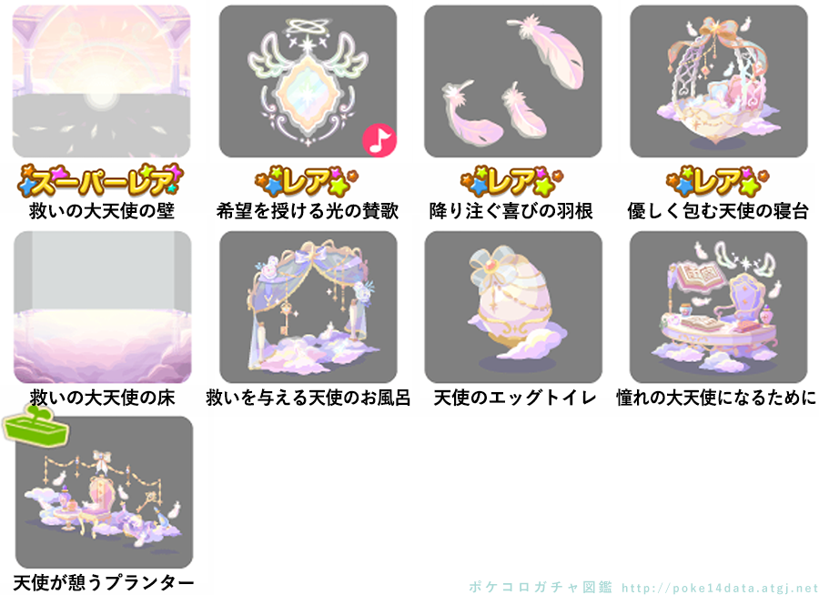 ★救いの大天使の壁 ☆希望を授ける光の賛歌(ネイロアイテム) ☆降り注ぐ喜びの羽根 ☆優しく包む天使の寝台 救いの大天使の床 救いを与える天使のお風呂 天使のエッグトイレ 憧れの大天使になるために 天使が憩うプランター