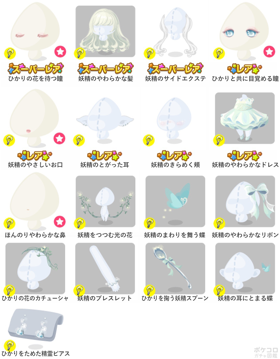 ★ひかりの花を待つ瞳(顔パーツ) ★妖精のやわらかな髪 ★妖精のサイドエクステ ☆ひかりと共に目覚める瞳(顔パーツ) ☆妖精のやさしいお口(顔パーツ) ☆妖精のとがった耳 ☆妖精のきらめく頬 ☆妖精のやわらかなドレス ほんのりやわらかな鼻(顔パーツ) 妖精をつつむ光の花 妖精のまわりを舞う蝶 妖精のやわらかなリボン ひかりの花のカチューシャ 妖精のブレスレット ひかりを掬う妖精スプーン 妖精の耳にとまる蝶 ひかりをためた精霊ピアス