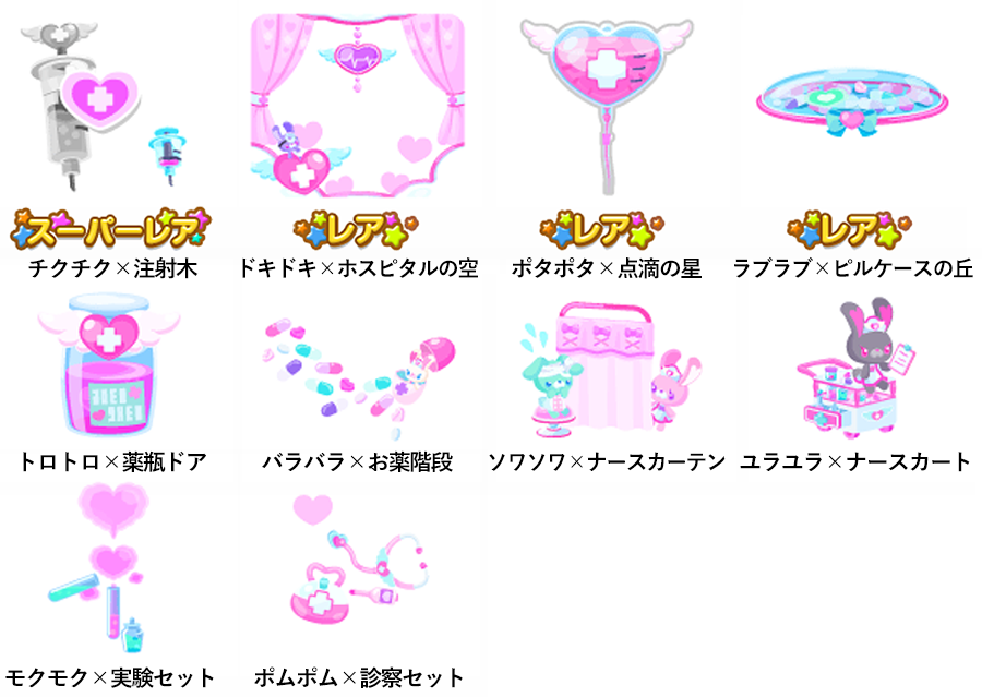 ★メロメロ×ハートアイ(顔パーツ) ★クルクル×ハートツイン ☆クラクラ×ハートアイ(顔パーツ) ☆サラサラ×ショート ☆フリフリ×ナースワンピ ☆ドキドキ×ナース帽 ☆チラチラ×ナースワンピ ☆ポトポト×ハート点滴 フワフワ×お薬セット ズルズル×白衣セット プルプル×お薬スーツ バタバタ×ドクターの白衣 ヒラヒラ×ナースリボン ルンルン×うさちゃん ツヤツヤ×ハート眼帯 タジタジ×患者服 グルグル×包帯スーツ ポワポワ×ハート薬品 ソワソワ×ハート注射