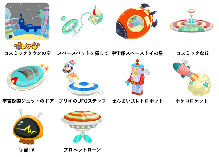 ☆コスミックタウンの空 スペースペットを探して 宇宙船スペーストイの星 コスミックな丘 宇宙探索ジェットのドア ブリキのUFOステップ ぜんまい式レトロボット ポケコロケット 宇宙TV プロペラドローン