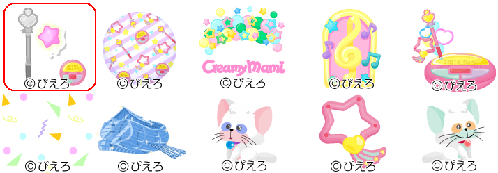 ★魔法のステッキの木 No.458 魔法のクリィミークレープ魔法のステッキの実 ☆魔法アイテムの星 クリィミーマミのロゴ マミ登場のドア 変身アイテムの階段 ☆ポップ幾何学の空 フェザースターの舟 ぱちくりポジ きらきらルミナスター ぱちくりネガ