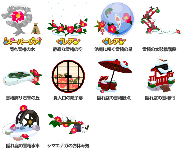 ★雪椿庭園の壁 ☆雪椿かまくら ☆雪椿の木 雪椿の御帳台 雪椿庭園の床 雪椿屏風風呂 雪椿の盆栽 雪椿ぼんぼり 雪つもる椿ラグ