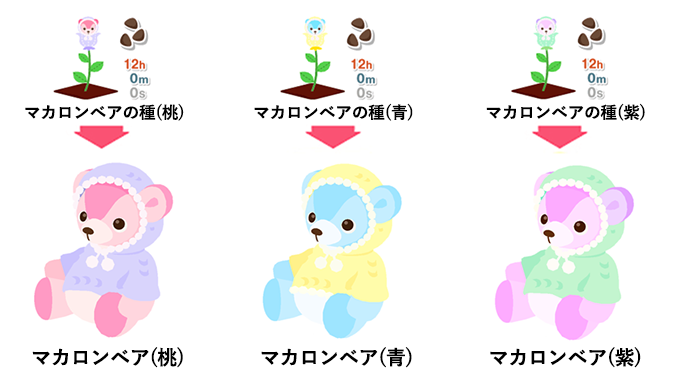 マカロンベアの種(桃) → マカロンベア(桃) マカロンベアの種(青) → マカロンベア(青) マカロンベアの種(紫) → マカロンベア(紫)