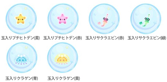 玉入りプチヒトデン(黄) (500) 玉入りプチヒトデン(赤) (500) 玉入りサクラエビン(赤) (500) 玉入りサクラエビン(緑) (500) 玉入りクラゲン(青) (500) 玉入りクラゲン(黄) (500)