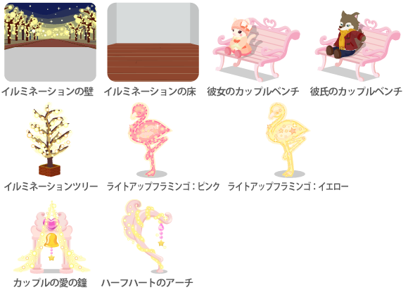 イルミネーションの壁 イルミネーションの床 彼女のカップルベンチ 彼氏のカップルベンチ イルミネーションツリー ライトアップフラミンゴ:ピンク ライトアップフラミンゴ:イエロー カップルの愛の鐘 ハーフハートのアーチ