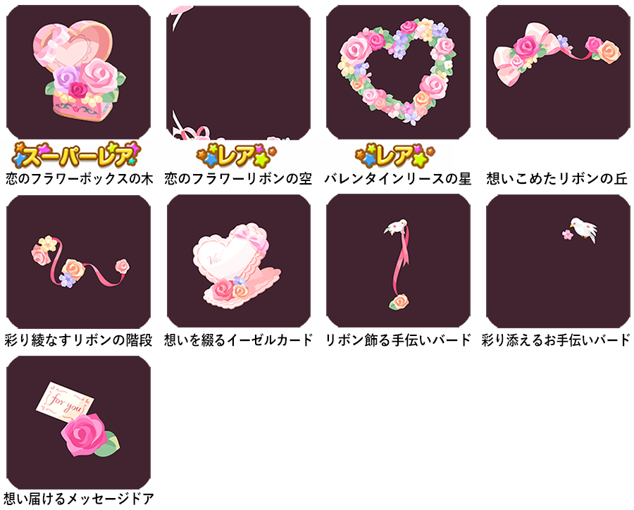 ★恋のフラワーボックスの木 No.1128 想い届けるカオマンガイ 恋のバードブローチの実 ☆恋のフラワーリボンの空 ☆バレンタインリースの星 想いこめたリボンの丘 彩り綾なすリボンの階段 想いを綴るイーゼルカード リボン飾る手伝いバード 彩り添えるお手伝いバード 想い届けるメッセージドア