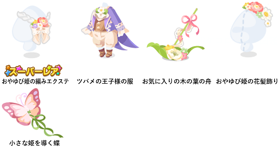 ★おやゆび姫の編みエクステ(F) ツバメの王子様の服(F) お気に入りの木の葉の舟(I) おやゆび姫の花髪飾り(F) 小さな姫を導く蝶(I)