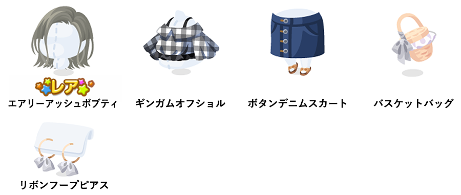 ☆エアリーアッシュボブティ ギンガムオフショル ボタンデニムスカート バスケットバッグ リボンフープピアス