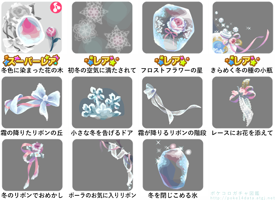 ★冬色に染まった花の木 No.1287 ポーラお手製ソルベ 冬を知らせる花びらの実 No.1288 ★ポーラお手製ソルベ ★冬を知らせる花びらの実 ☆初冬の空気に満たされて ☆フロストフラワーの星 ☆きらめく冬の種の小瓶 霜の降りたリボンの丘 小さな冬を告げるドア 霜が降りるリボンの階段 レースにお花を添えて 冬のリボンでおめかし ポーラのお気に入りリボン 冬を閉じこめる氷