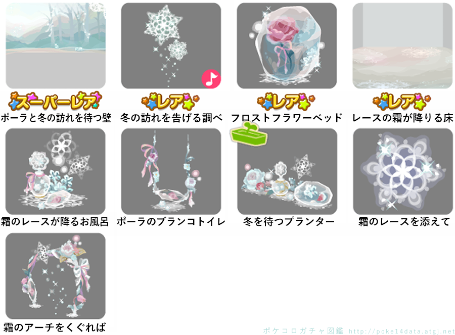 ★ポーラと冬の訪れを待つ壁 ☆冬の訪れを告げる調べ(ネイロアイテム) ☆フロストフラワーベッド ☆レースの霜が降りる床 霜のレースが降るお風呂 ポーラのブランコトイレ 冬を待つプランター 霜のレースを添えて 霜のアーチをくぐれば
